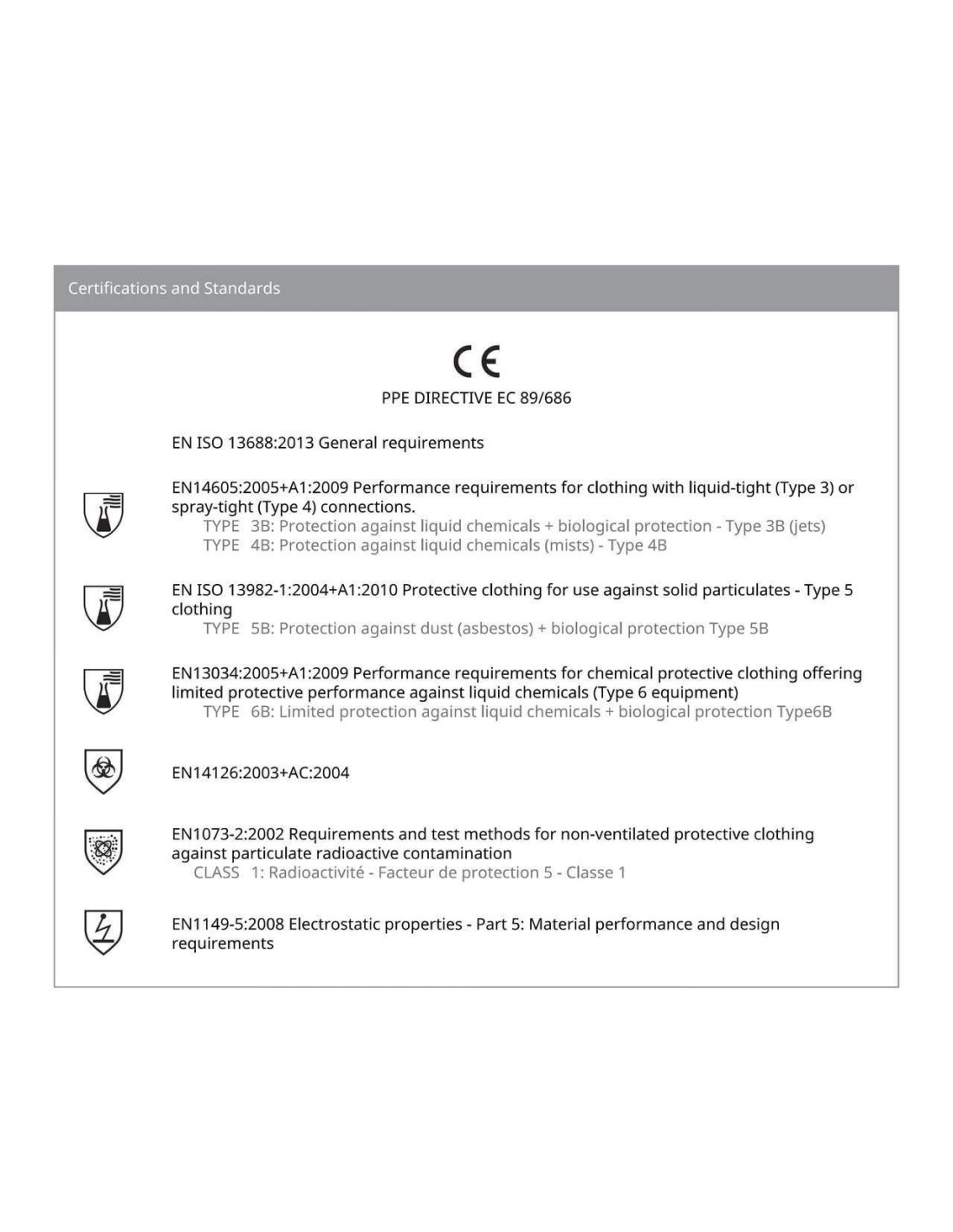 EN14605:2005+A1:2009 Requisiti prestazionali per indumenti con collegamenti a tenuta contro liquidi (Tipo 3) o spruzzi (Tipo 4).