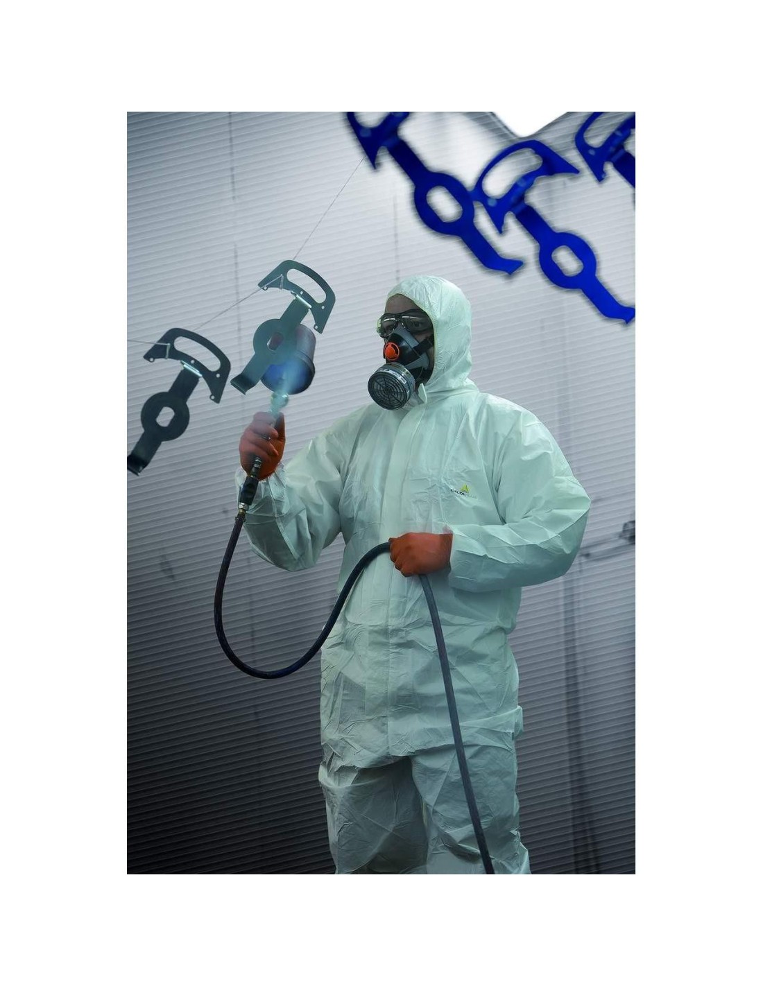 Tuta con cappuccio elasticizzato. Deltatek® 5000 non tessuto laminato microporoso. Chiusura con zip doppio cursore sotto baverina adesiva.