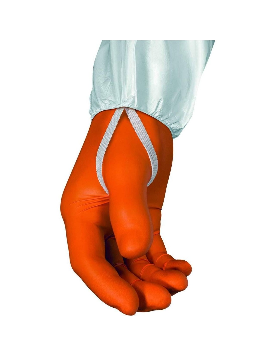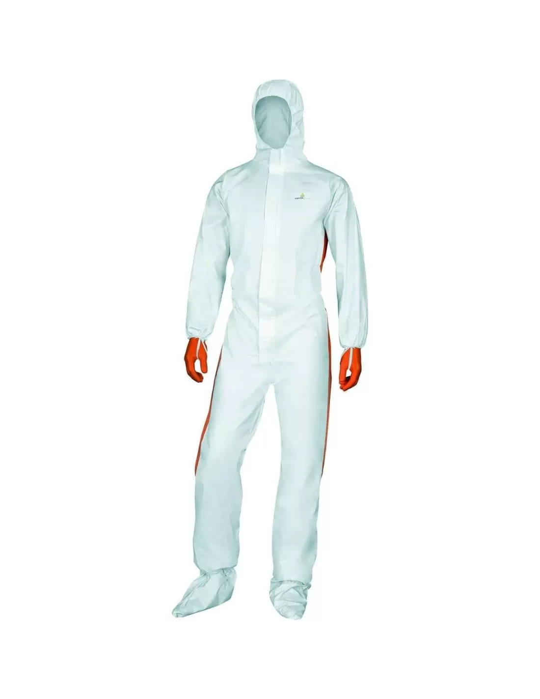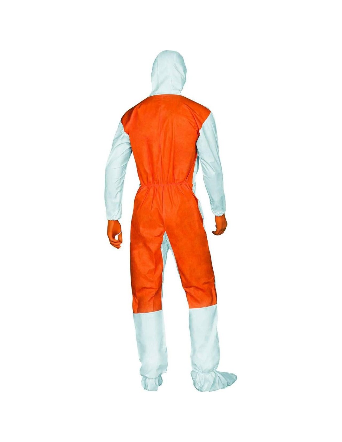 Tuta con cappuccio elasticizzata non tessuto a 3 parti. Composta da 2 materiali: Laminato microporoso et SMS.