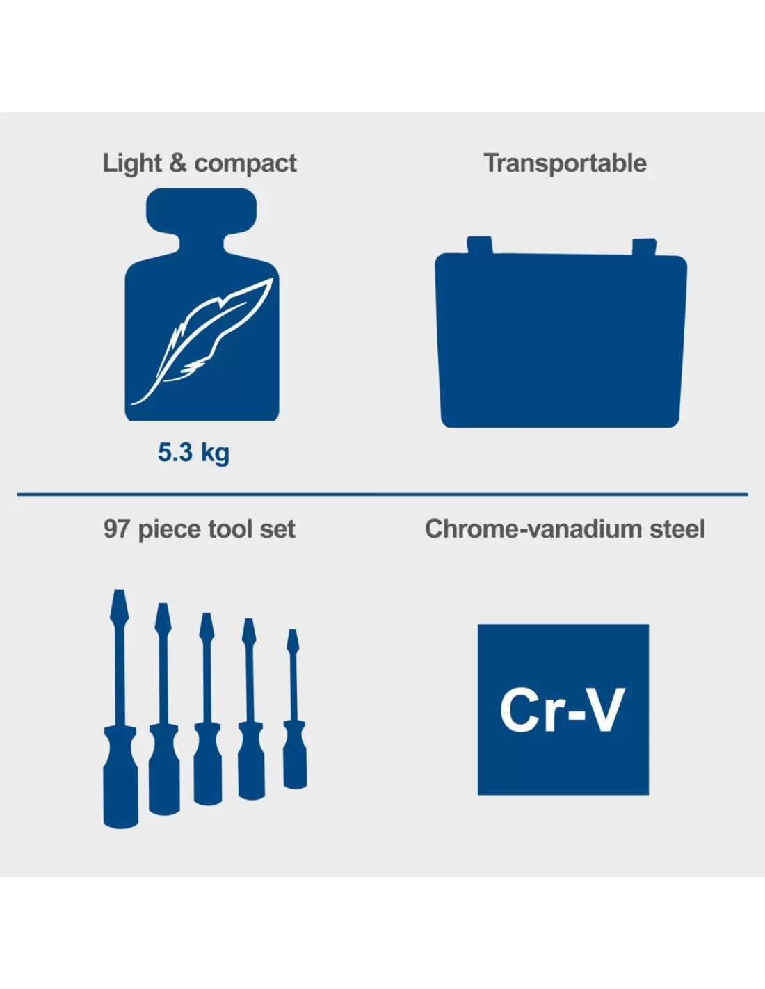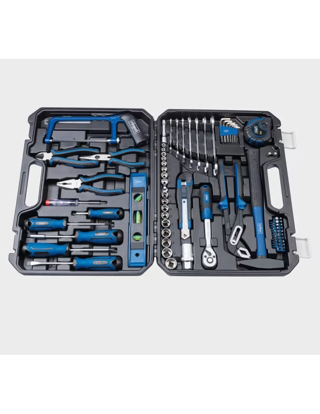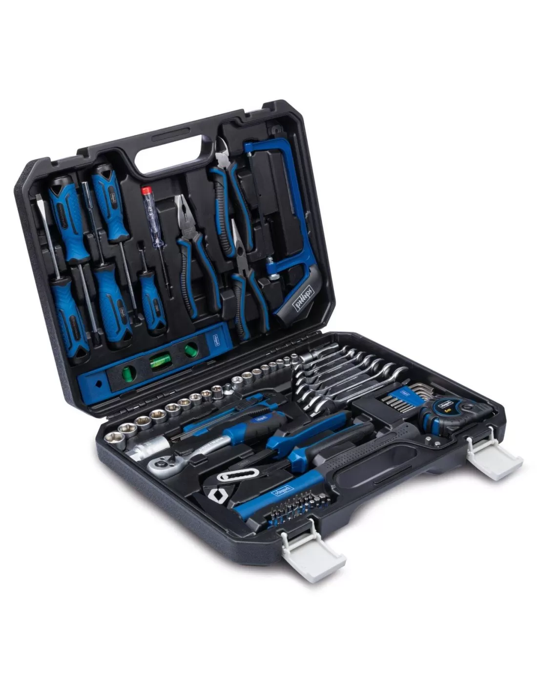 La valigetta portautensili Scheppach WZK120 è un set completo di 97 strumenti pratici, perfetto per l'uso domestico, in cantiere, in officina o in campeggio. Questo assortimento di attrezzi è racchiuso in una robusta valigetta di plastica, progettata per la massima praticità. Con un peso di soli 5,3 kg e dimensioni compatte di 425x320x80 mm, la WZK120 è ideale per un uso mobile e facile da trasportare.