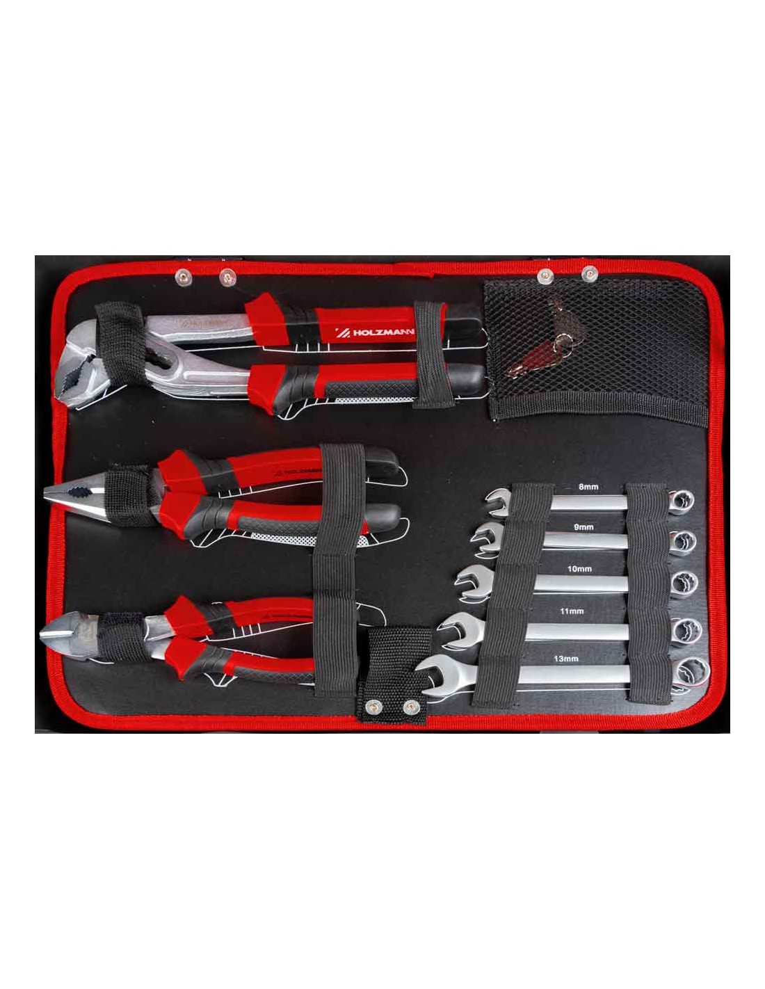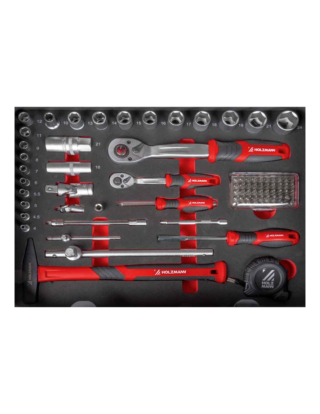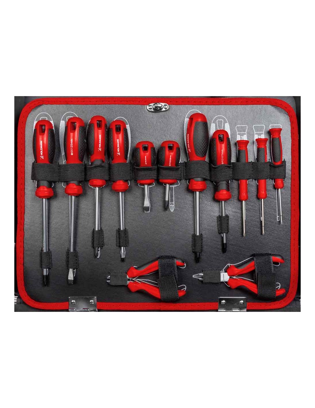 La cassetta portautensili HOLZMANN WZK119ECO con un set di utensili da 119 pezzi è suddivisa e ordinatamente riposta in 4 scomparti in un pratico formato a valigetta con maniglia.
