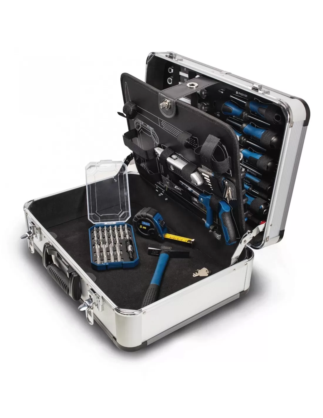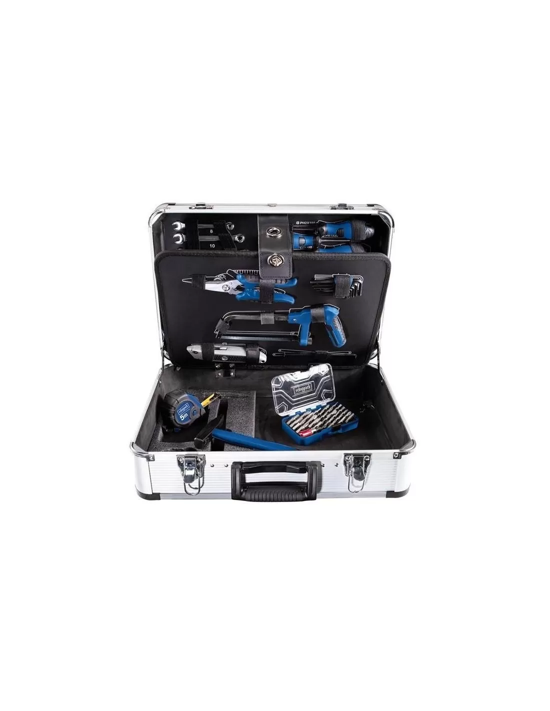• Include tra l'altro 1 cricchetto reversibile con vari attacchi, 1 pinza per pompa dell'acqua, pinza universale, taglierina laterale, taglierino, martello, sega a mano, forbici multiuso, tester di tensione, metro a nastro e diverse chiavi combinate, cacciaviti, chiavi esagonali e punte di diverse dimensioni