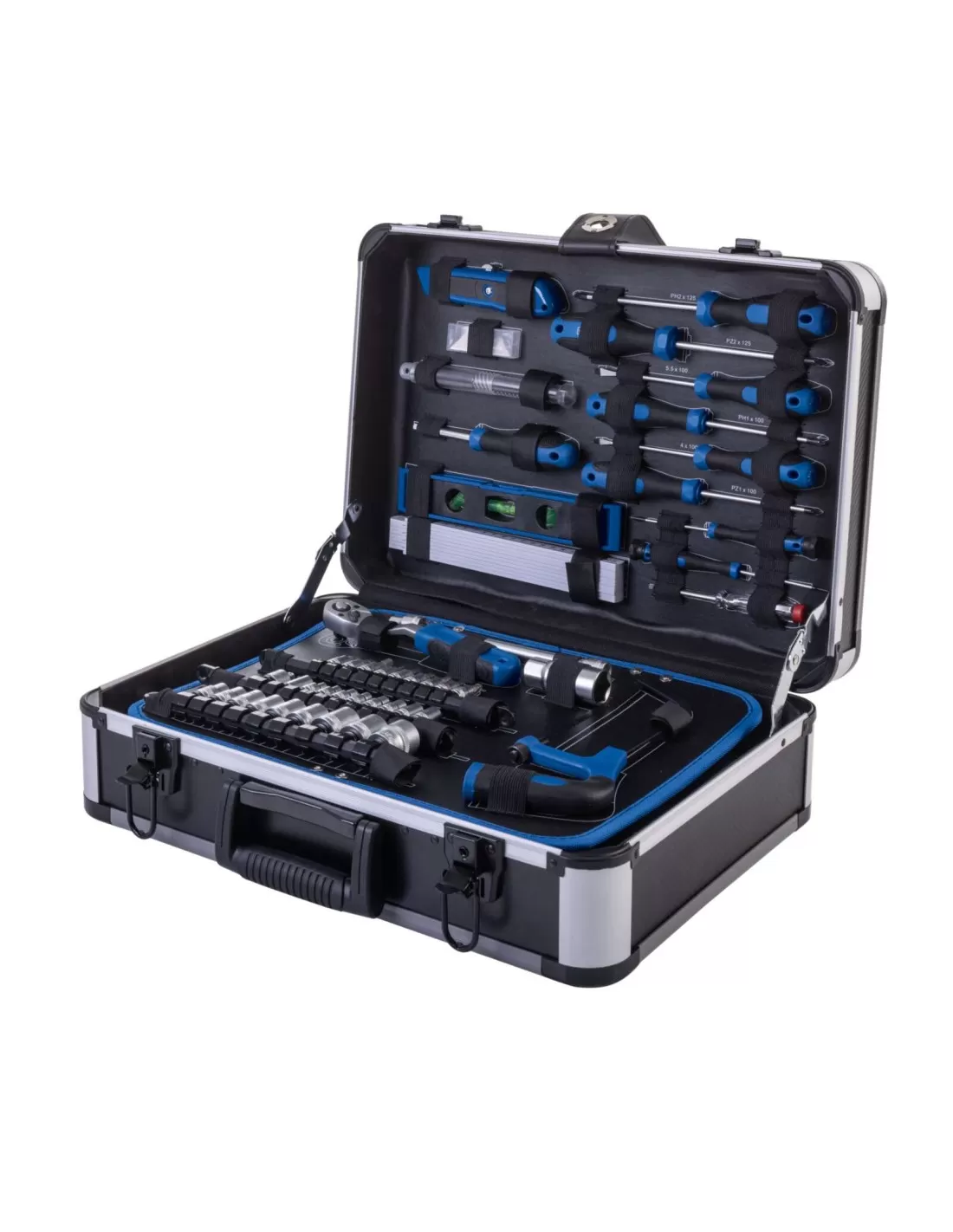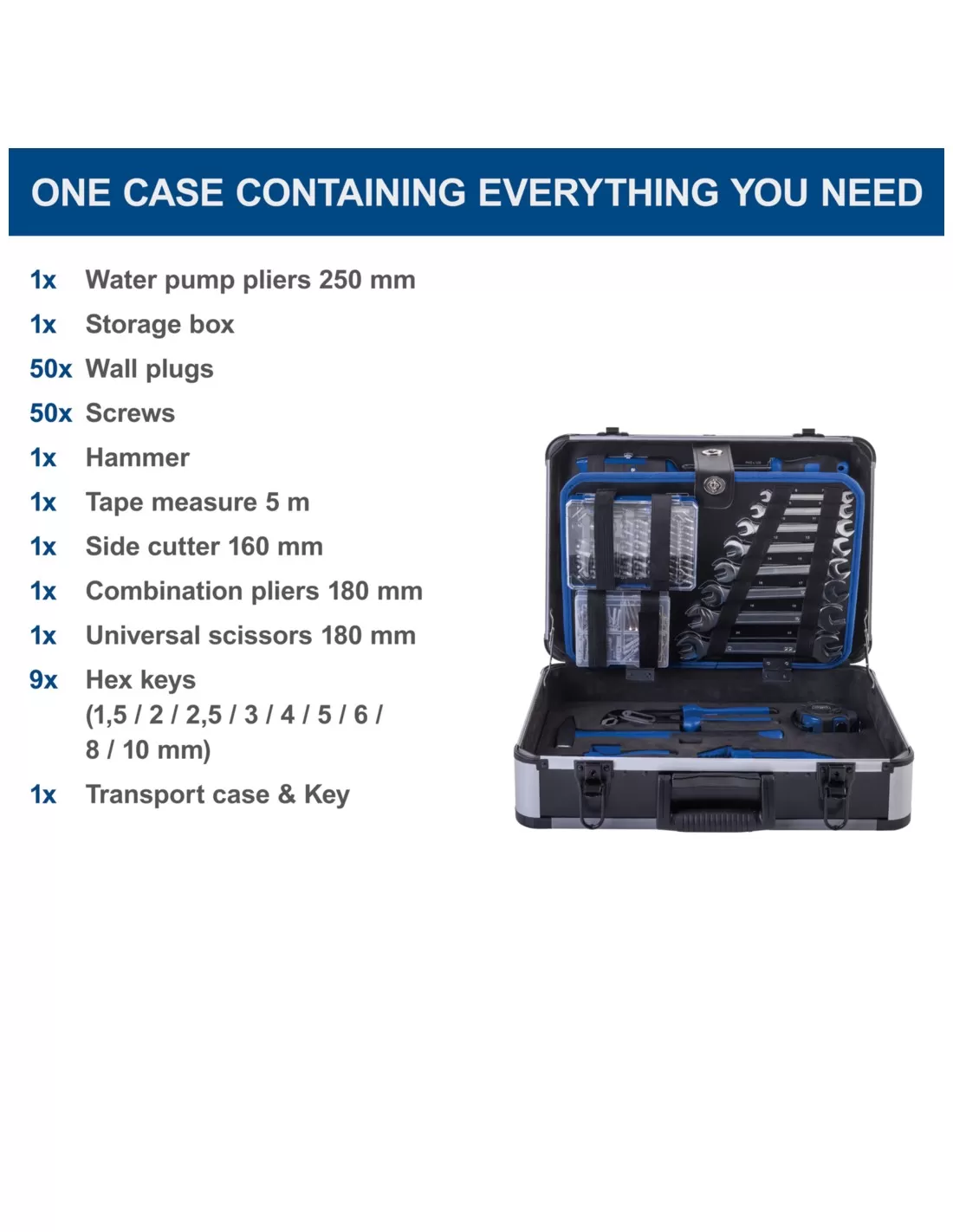 1 taglierino, 5 lame di ricambio, 1 livella a bolla di precisione da 225 mm, 6 cacciaviti PH1 x 100 mm / PH2 x 125 mm / PZ1 x 100 mm / PZ2 x 125 mm / 0,8 x 4,0 x 100 mm / 1,0 x 5,5 x 100 mm, 2 cacciaviti di precisione PH0 x 75 mm / 0,4 x 2,0 x 75 mm, 1 cercafase 125-250 V, 1 sega a mano 150 mm, 6 lame di ricambio per sega a mano 150 mm / 3 per metallo, 3 per legno, 8 chiavi a forchetta 6-22 mm, 1 porta punte, 1 porta punte a sgancio rapido, 50 set di punte, 101 assortimento di elementi di fissaggio (50 viti, 50 tasselli), 1 pinza per pompa idraulica 250 mm, 1 martello 300 mm g, 1 metro a nastro 5 m, 1 tronchese laterale