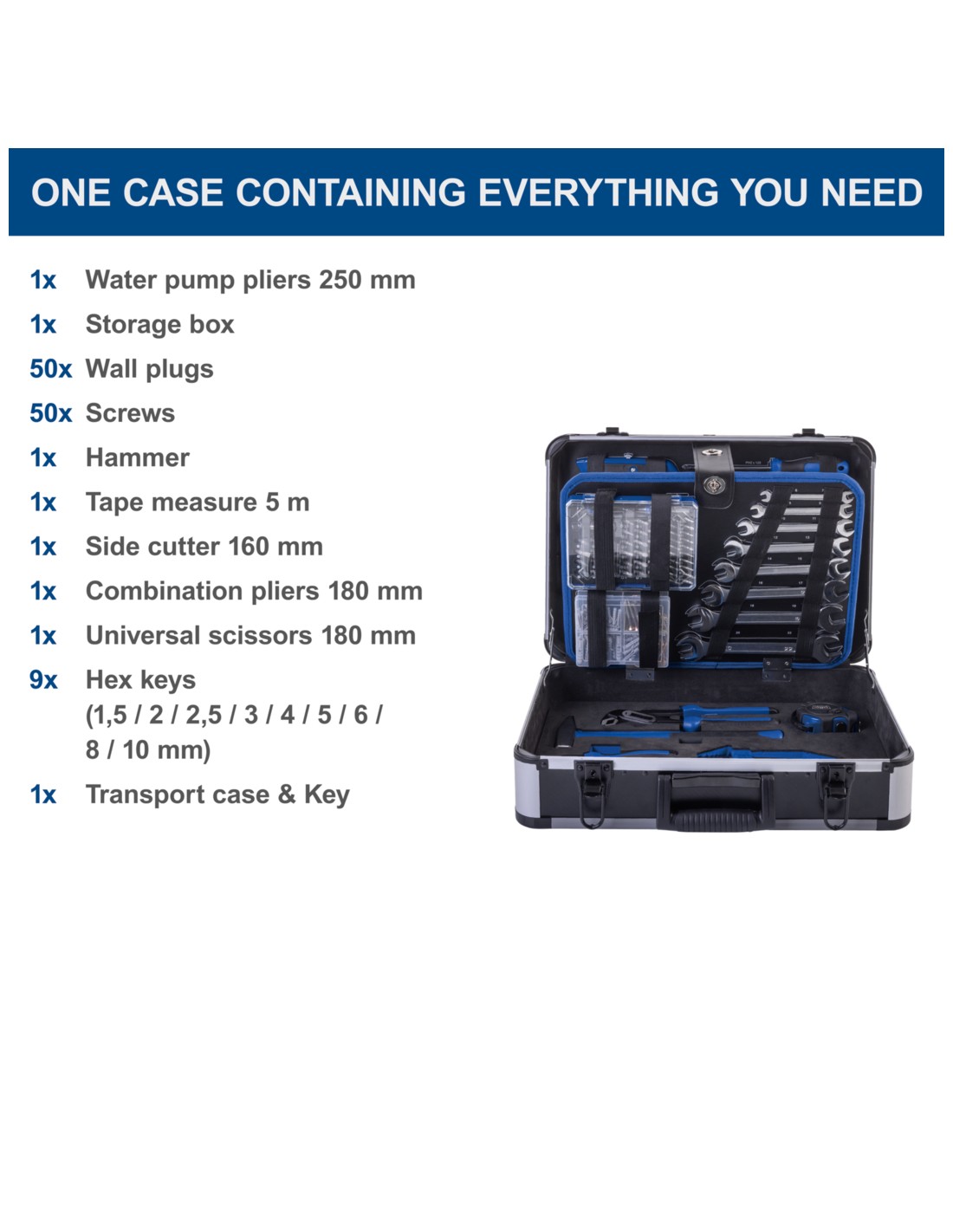 160 mm, 1 pinza combinata 180 mm, 1 forbice universale 180 mm, 9 chiavi a brugola
