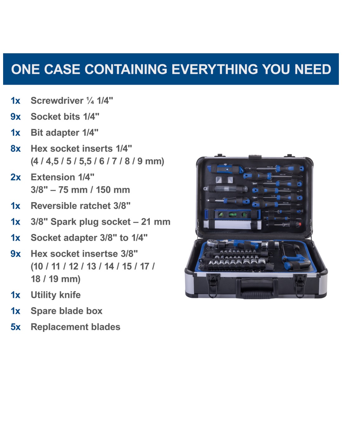 o 1 cacciavite da ¼ 1/4"", 9 bussole da 1/4"", 1 adattatore per inserti da 1/4"", 9 bussole esagonali da 4 / 4,5 / 5 / 5,5 / 6 / 7 / 8 / 9 mm, 2 prolunghe da 3/8"" - 75 mm / 100 mm, 1 cricchetto reversibile da 3/8"", 1 bussola per candele da 3/8"" - 21 mm, 1 adattatore per bussole da 3/8"" a 1/4"", 9 bussole esagonali da 10 / 11 / 12 / 13 / 14 / 15 / 17 / 18 / 19 mm,