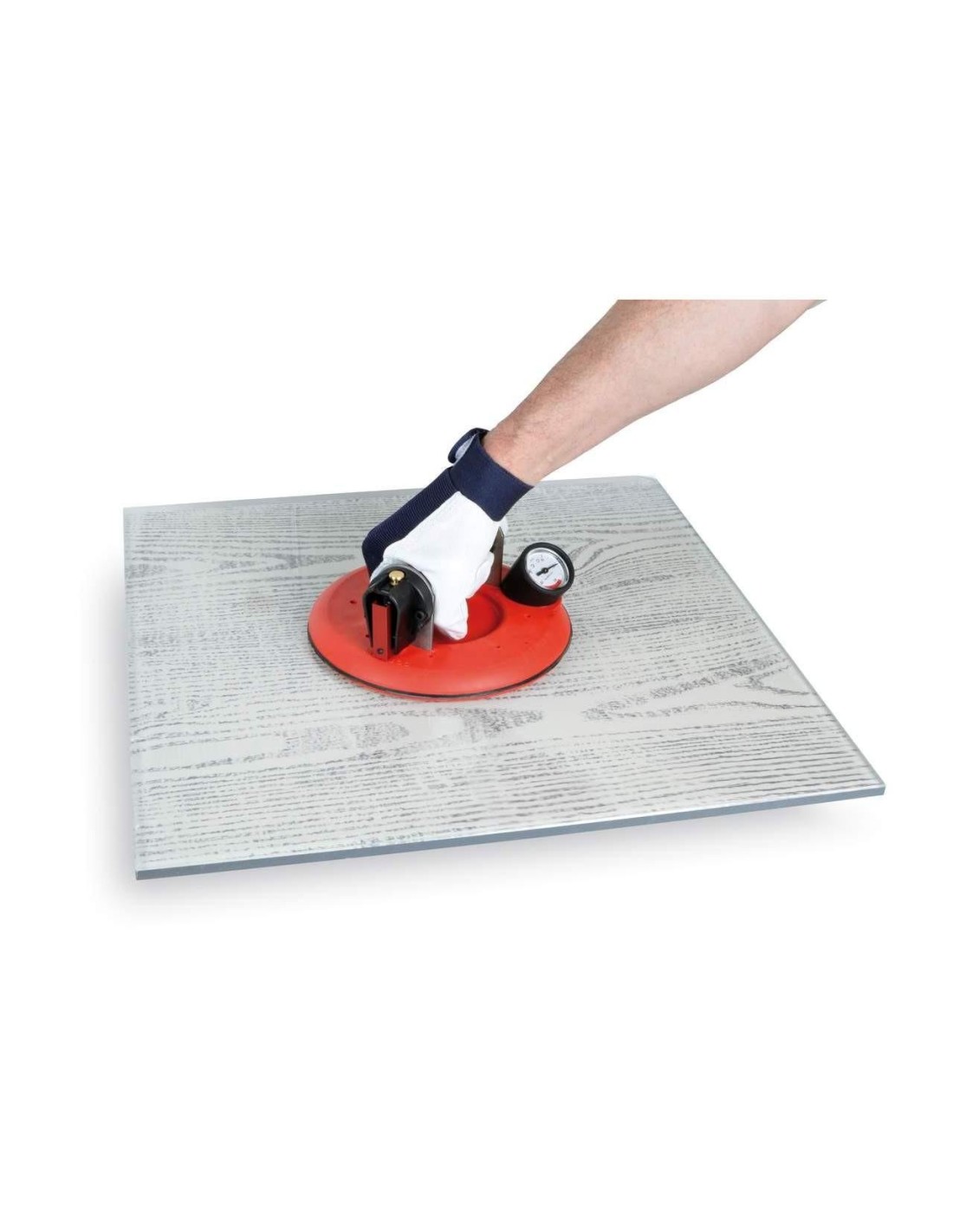 Ventosa di grande diametro (Ø 20cm) dotata di “vuotometro” strumento che indica istantaneamente l’eventuale perdita di adesione con la piastrella a tutto vantaggio della sicurezza.